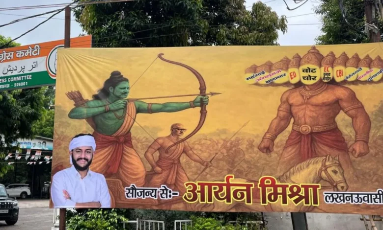 लखनऊ। देशभर में गुरुवार को विजयदशमी का पर्व मनाया गया, लेकिन उत्तर प्रदेश की राजधानी लखनऊ में कांग्रेस कार्यालय के बाहर लगाया गया एक पोस्टर चर्चा का विषय बन गया। इस पोस्टर में राहुल गांधी को भगवान राम और प्रदेश अध्यक्ष अजय राय को लक्ष्मण के रूप में दिखाया गया है।