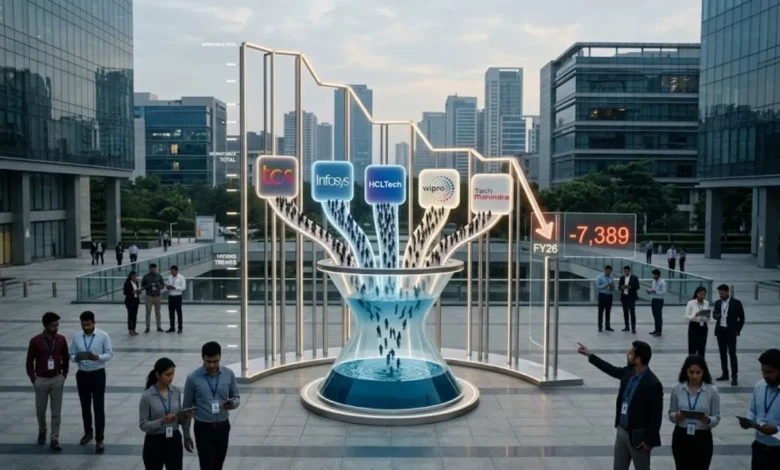 FY26 में टॉप 5 IT कंपनियों के कुल कर्मचारियों की संख्या में 7,389 की गिरावट दर्ज की गई, जो पिछले साल की हल्की बढ़ोतरी के बिल्कुल उलट है।